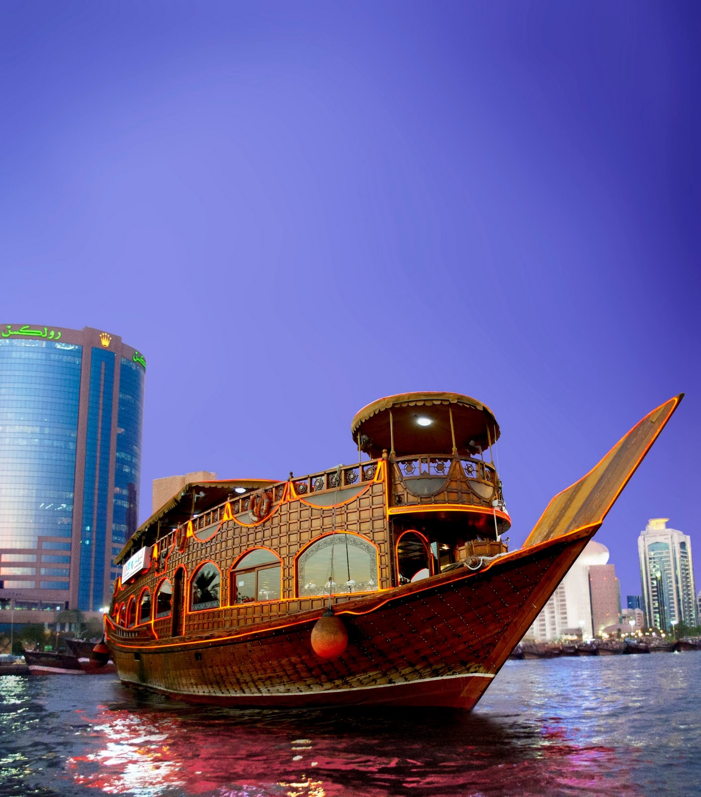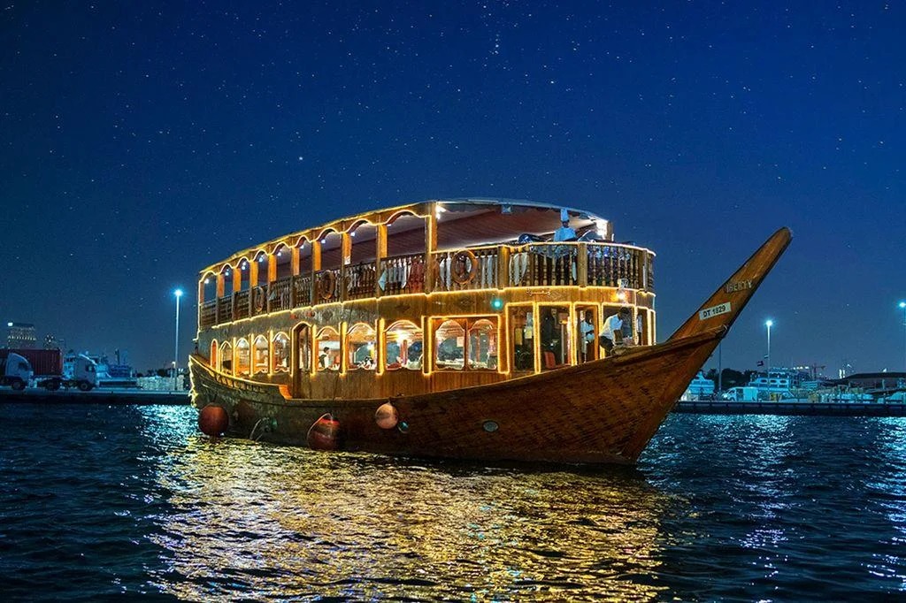Embark on an enchanting evening aboard a traditional wooden dhow, gliding through the illuminated waters of Dubai Marina. This captivating cruise offers a unique perspective of Dubai’s skyline, featuring iconic landmarks such as the twisting Cayan Tower, the luxurious Bluewaters Island, and the majestic Ain Dubai Ferris wheel.