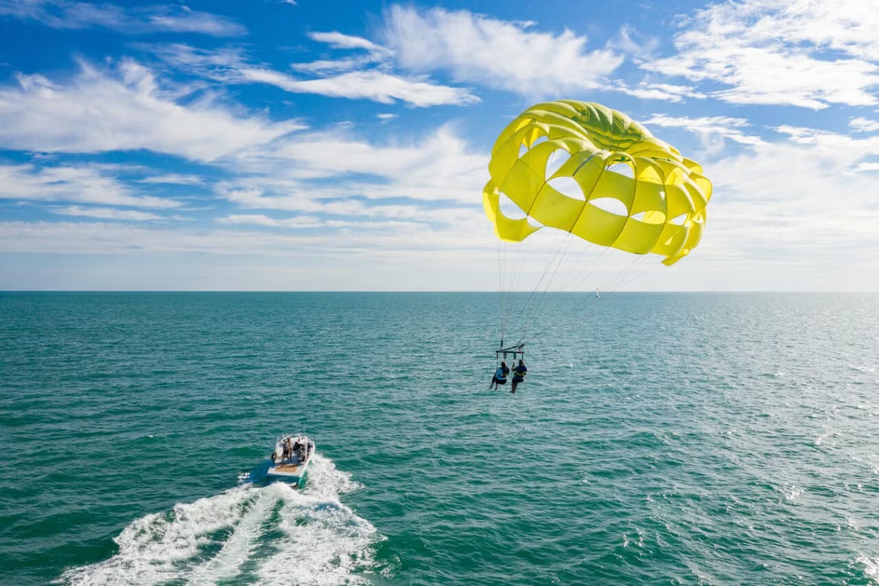 Parasailing is a thrilling water sport that lets you soar through the sky while being towed behind a boat, harnessed to a specially designed parachute. As the boat speeds up, you gently lift off the water and rise into the air, enjoying breathtaking panoramic views — often of beaches, coastlines, or city skylines, depending on your location.
